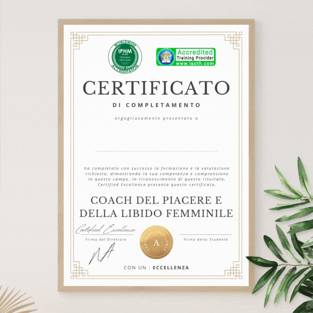 Scegliendo il nostro corso, investi in un’expertise senza eguali e nell’affermazione della tua reputazione come Coach Certificato in Libido e Piacere Femminile. Una volta completato il corso, sarai in grado di accompagnare e trasformare vite, offrendo speranza e supporto a ogni donna che guiderai verso una riconnessione intima con il proprio potere sensuale.