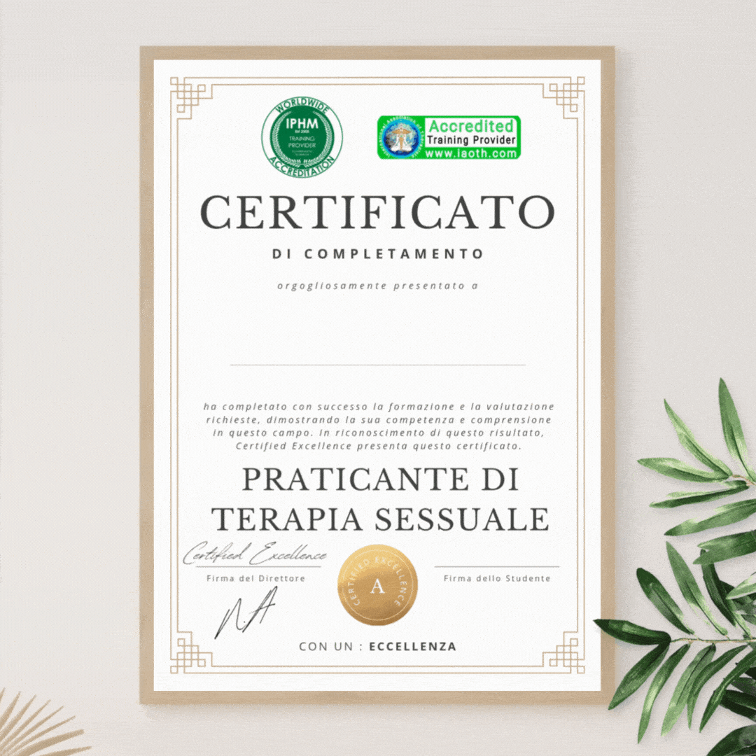 Scegliendo il nostro corso, investivi in un’esperienza senza pari e nell’instaurazione della tua reputazione come Professionista della Terapia Sessuale certificato. Una volta completato il percorso, sarai in grado di accompagnare e trasformare vite, offrendo prospettive di evoluzione a ogni persona che guiderai.