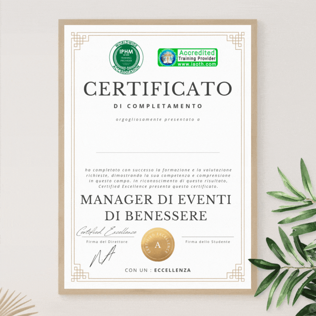 Scegliendo il nostro corso, investi in un’expertise incomparabile e nell’établissement della tua reputazione come Manager di Eventi di Benessere certificato. Una volta completato il corso, sarai in grado di progettare e animare eventi di benessere che ispirano, trasformano e lasciano un’impronta duratura nella vita di ogni partecipante.
